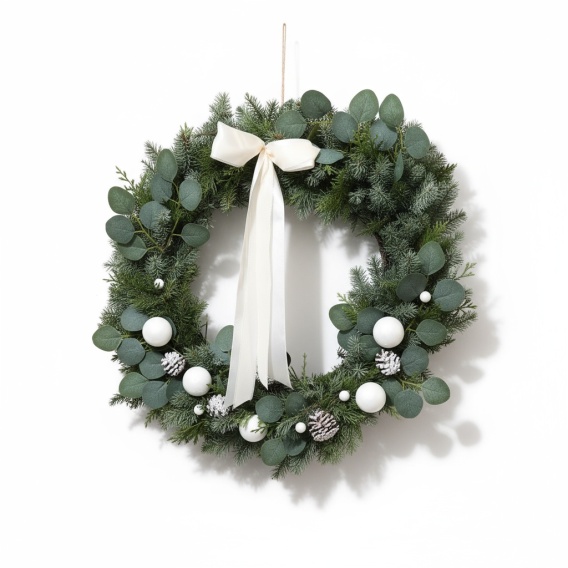 Wieniec łączy tradycję bożonarodzeniową z nowoczesną estetyką - klasyczna zieleń jodły, szaroniebieskie gałązki eukaliptusu, białe bombki i naturalne szyszki tworzą harmonijną, elegancką kompozycję. Biała wstążka dodaje świątecznego charakteru.